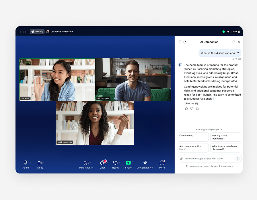 - Native integration: Embedded in Meetings, Chat, Phone and Whiteboard.